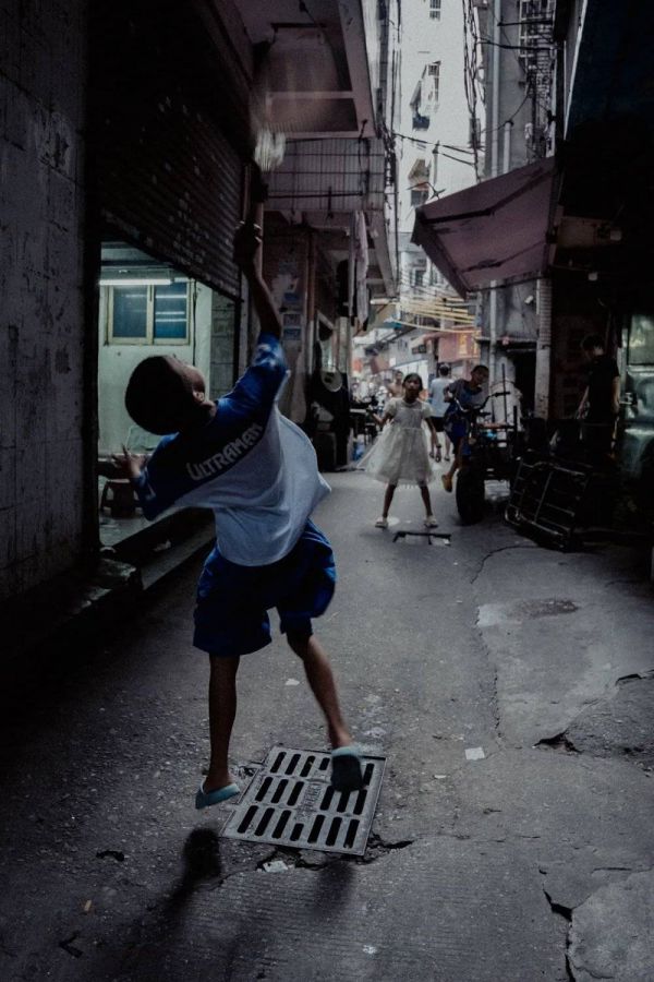 在康鹭幽暗小巷中打羽毛球的孩童
