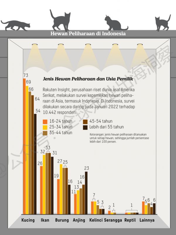 另据美国全球研究公司Rakuten Insight于2022年1月对10442名印尼宠物主进行的线上调查,结果显示了更广泛的宠物拥有情况。