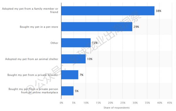 从宠物获得渠道看:这种特殊待遇与养宠的动机是分不开的。根据Rakuten Insight的研究结果,这些宠物大多是通过领养和购买获得的。38%是从亲戚或朋友那里领养,29%是在宠物店购买,还有从动物收容所领养的,占10%,也有从值得信赖的饲养者那里购买,占7%。截至2022年1月,印尼宠物主获得宠物的主要渠道如下图所示: