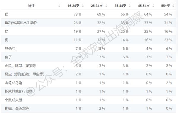 转换成表格来看,各年龄段养宠类型占比详情如下表所示: