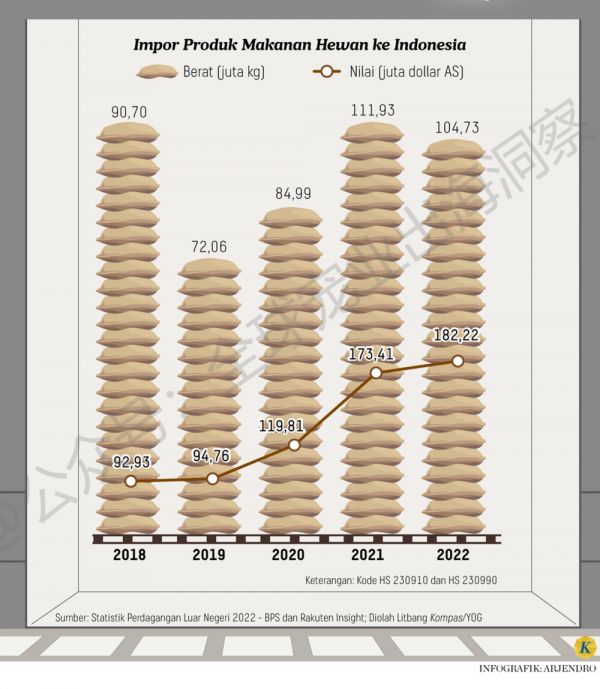 此外,《2022年对外贸易统计》(BPS)的数据显示,编码为HS 2309的宠物食品,包括狗和猫的宠物食品(HS 230910)和其他宠物的宠物食品(HS 230990),其进口量每年都在持续增长。2018年,进口商品编码为HS 230910的猫狗宠物食品达到9293万美元。2022年这一数额还将增加,即达到1.8222亿美元。