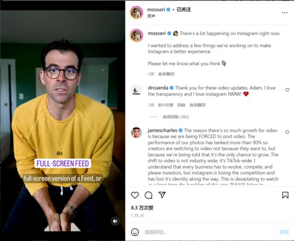 在 Ins 的这次改版风波中,Instagram 的 CEO Adam Mosseri 曾发布视频,就 Instagram 大举转向短视频引发的争议作出解释,称产品改版是为了顺应用户对短视频内容的喜爱、让用户体验更好。