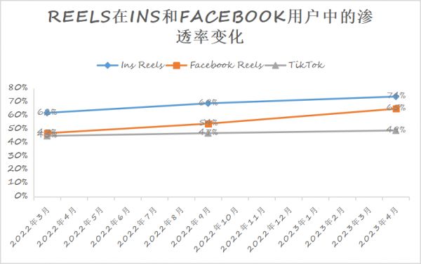 * 注意,上图中 Reels 渗透率是以 2000 人中的 Ins 和 Facebook 用户为分母计算,而 TikTok 是以用户总数为分母,不能直接对比增速。画在一张图里面,是为了大致了解渗透率趋势。