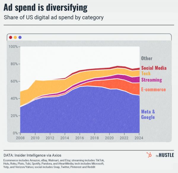 没错,“Meta 和 Google”都强到够单列为一个分类了,并且,这个类别的份额,一度能占到美国数字广告的半壁江山。