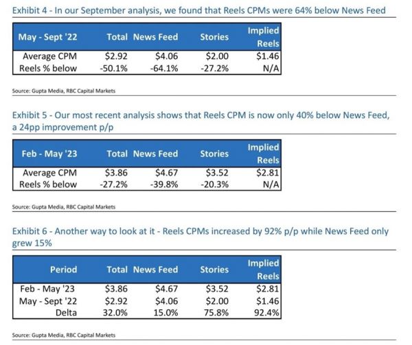 根据数字营销机构 Gupita Media 和加拿大皇家银行资本市场的分析推算,Reels 在 2022 年 5-9 月期间的 CPM 均值仅为 1.46 美元,比 News Feed 广告低 64%;到了 2023 年 2-5 月期间,Reels 的 CPM 均值涨到了 2.81 美元,虽然仍远低于 NewsFeed 的 4.06 美元以及 Meta 广告的 CPM 均值 3.86 美元,但其涨幅高达 92.4%,是 Meta 家几个渠道中涨幅最高的。