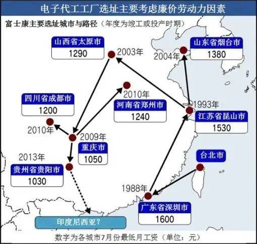 富士康的迁移路线,最大的特征就是寻找低廉人力成本的洼地。也就是哪里工资低就去哪里。