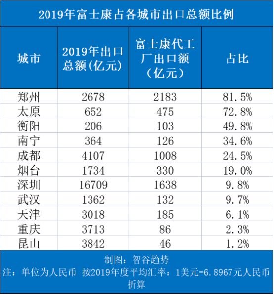 智谷趋势在两年前曾经统计过,郑州,太原、衡阳、南宁、成都等许多地方都患上了“富士康依赖症”,出口总额里富士康代工厂出口的占比都在 20% 以上。