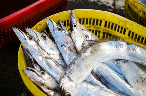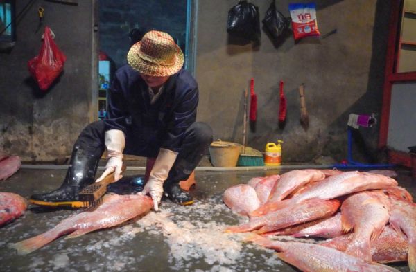 “现在为了能卖好价格,方法可太多了。冻久的鱼,腮帮子暗,那就染染色咯,灯再一照,没人能看出来。你买的话就得看眼珠子和体形,最好按一下”,眯眼叔拿起一条品质高的给我看:眼亮,体型流线紧凑细长,按着肉就扎实,这是好鱼。
