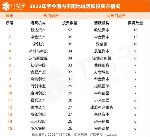 IT 桔子统计了 2023 年以来国内热门城市和非热门城市活跃投资方情况。有意思的是,两者上榜机构出现了较大差别,如下图所示:
