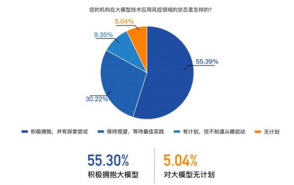 与此对应的是,55.39%受访银行机构已经“积极拥抱大模型,并有探索尝试”、30.22%受访银行机构选择“保持观望、但时刻关注等待最佳实践案例出现”。