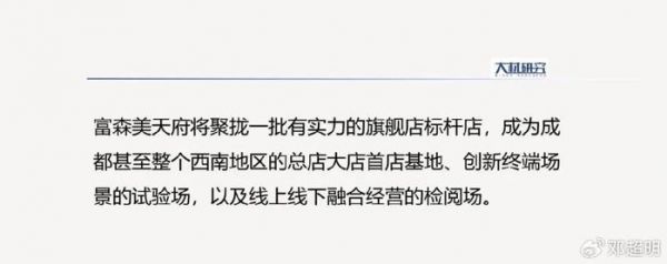 简单而言,富森美天府将聚拢一批有实力的旗舰店标杆店,成为成都甚至整个西南地区的总店基地、创新终端试验场。