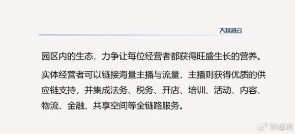 更具体来讲,园区覆盖直播产业链上下游,从实体店、供应链选品到直播、培训、广告、投流、内容分发,整个产业链形成闭环,可以实现资源的内部流动与供需的快速对接。