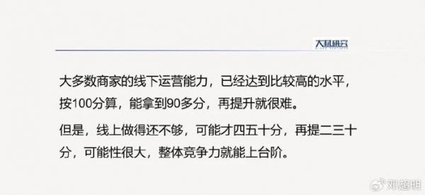 吴宝龙认为,大多数商家的线下运营能力已经达到比较高的水平,按100分来算,能拿到90多分,想再提升一下,无疑很难。但是,线上做得还不够,可能才40分、50分,再提二三十分,可能性很大,整体竞争力就能再上台阶。
