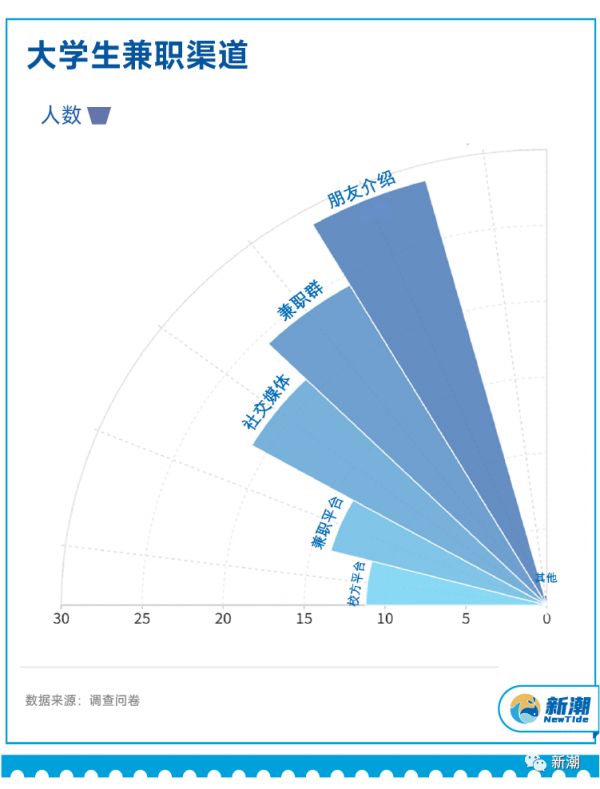 问卷调查显示,朋友之间相互介绍,是大学生找兼职的主要渠道,占比达57.89%。