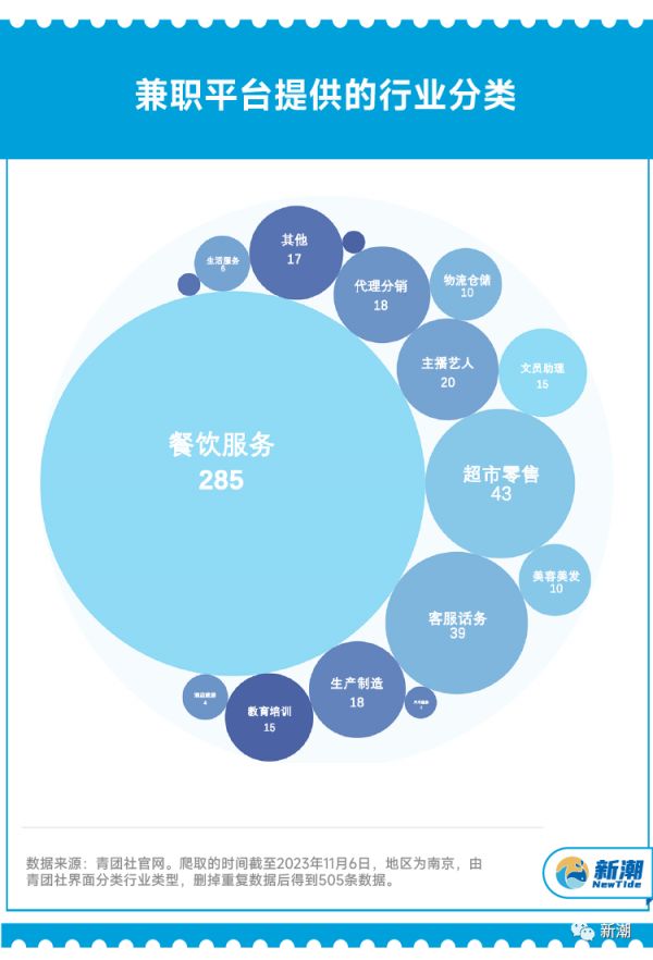 这些平台上的兼职机会都来自哪些行业?新潮以青团社为例,爬取平台上的兼职信息,数据分析发现,发布兼职信息最多的是餐饮行业,包括餐厅服务员、奶茶店员工、外卖员等。其次是销售、客服、网络主播、教育培训、仓储物流等。