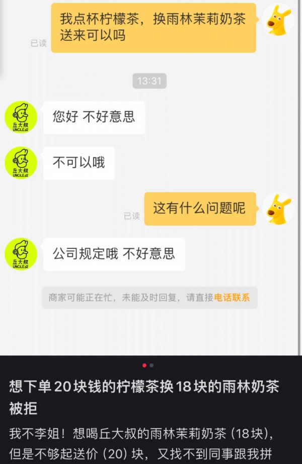 此外,丘大叔的外卖业务也频频被顾客吐槽,丘大叔大部分产品的单杯定价不足起送标准,必须要加买小料或和他人拼单才能购买,这在无形之中降低了顾客“冲动消费”的频次。