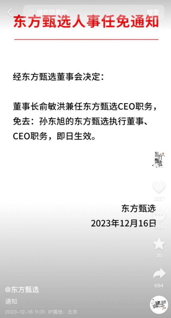 12月16日中午,东方甄选发布公告称,经东方甄选董事会决定,董事长俞敏洪兼任东方甄选CEO职务,免去孙东旭的东方甄选执行董事、CEO职务,即日生效。
