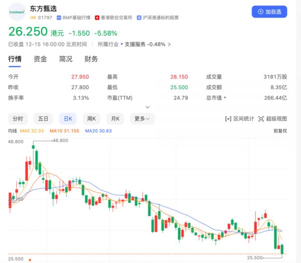 截至12月15日港股收盘,东方甄选股价当天再次下跌5.6%,总市值降至266.4亿港元,一周内东方甄选总市值蒸发超70亿港元。