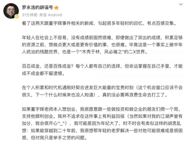 率先跳出来的是俞敏洪的老部下罗永浩。12月15日下午,罗永浩在微博上公开招揽董宇辉,称愿意攒局支持董宇辉创业。“如果董宇辉老师本人想创业,我很愿意跟一些做投资和做企业的朋友们攒一个局,支持他顺利创业。”