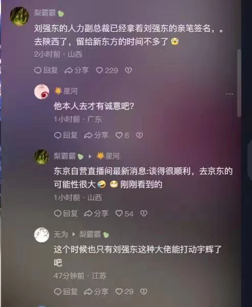 刘强东成为罗永浩口中想要挖角董宇辉的热门公司之一。一张网传截图显示,“刘强东的人力副总裁已经拿着刘强东的亲笔签名,去陕西了,留给新东方的时间不多了。”