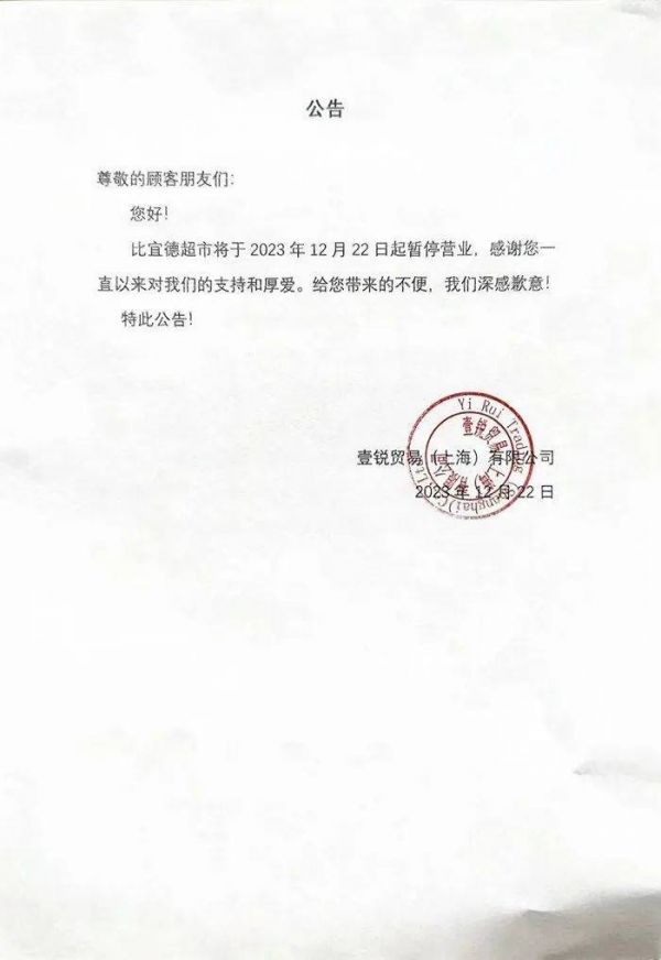 12月23日,主打硬折扣的低价超市比宜德发布公告,宣布自12月22日起暂停营业。