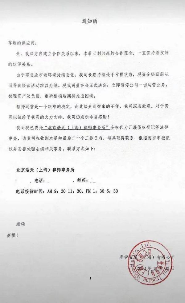 据网络上流传出的一则比宜德母公司壹锐贸易(上海)有限公司致供应商的《通知函》显示,由于零售业市场环境的变化,比宜德长期处于亏损状态而致资金链断裂,因此决定停止一切经营活动,并将相关债权登记等法律事务委托给律所负责。