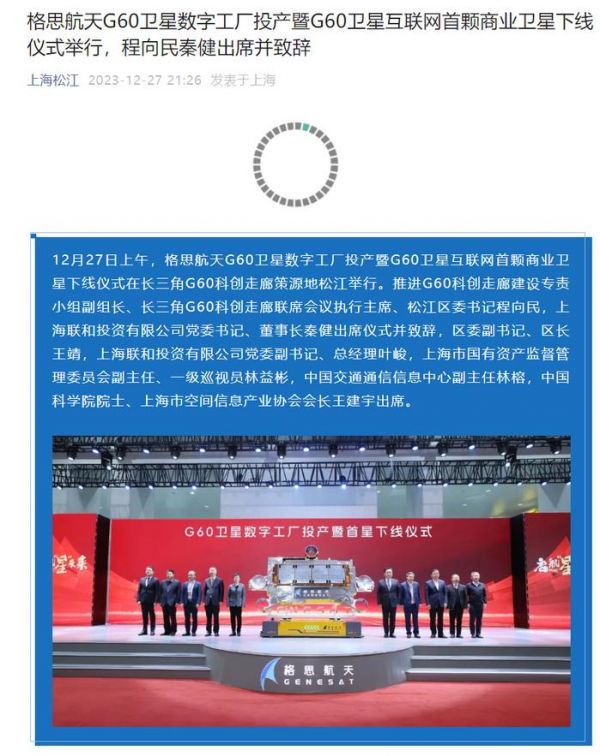 IT之家 12 月 28 日消息,据上海松江公众号消息,格思航天 G60 卫星数字工厂正式投产,G60 卫星互联网首颗商业卫星下线。