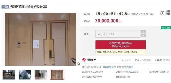 阿里资产·司法网站的拍卖信息显示,王国安拟被拍卖的房产位于天河区临江大道419号2402房。该房产权属人有两人,为王国安与倪素婷;不动产权证号也有两个,分别是粤(2017)广州市不动产权第02015263号、粤(2017)广州市不动产权第02015264号。房子的建筑面积为365.8933平方米,登记时间是2017年12月27日。该房产将于1月12日上午10点开拍。