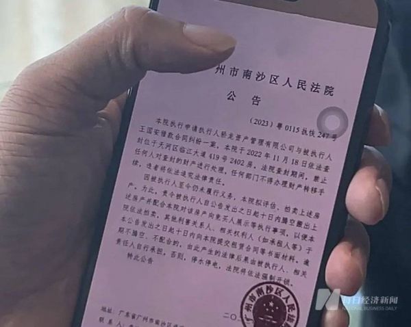 王国安向记者展示的法院查封房产公告 图片来源:每经记者 王帆 摄