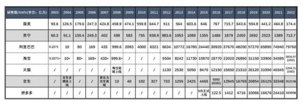 从 " 两强争霸 "、到 " 一枝独秀 "、到 " 双雄际会 "、再到 " 三国纷争 ",中国的 " 零售业 " 就如同一部跌宕起伏的历史巨作,充满了戏剧化。为了更好的辅以数据视角,来 " 还原 " 这一过程,我们整理出了如下的图表 1。简要说明一下:数据主要来源于年度财报、权威统计、网络搜索等渠道,并基于多方印证、逻辑推算、合理假设等方法,尽可能确保数据的真实有效(欢迎各位读者勘误);另外,图表中主要列举的是各家企业的销售额或者 GMV,尽管这一单一性指标并不能完全反映 " 企业和竞争全貌 ",但我们的主要目的是从数据中捕捉大的发展趋势,因而简化对比。