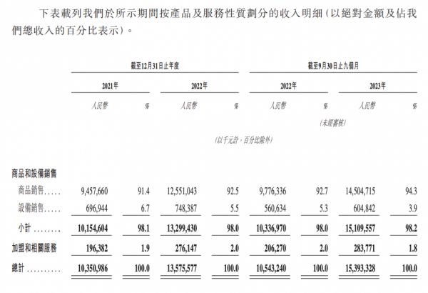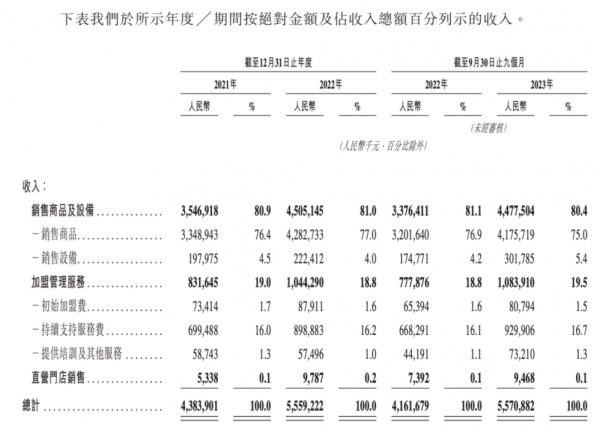 两家的收入几乎全部来自加盟商,包括向加盟商卖商品、卖设备,收加盟费、服务费、培训费。相同的是,两家的大头都是销售商品的收入。