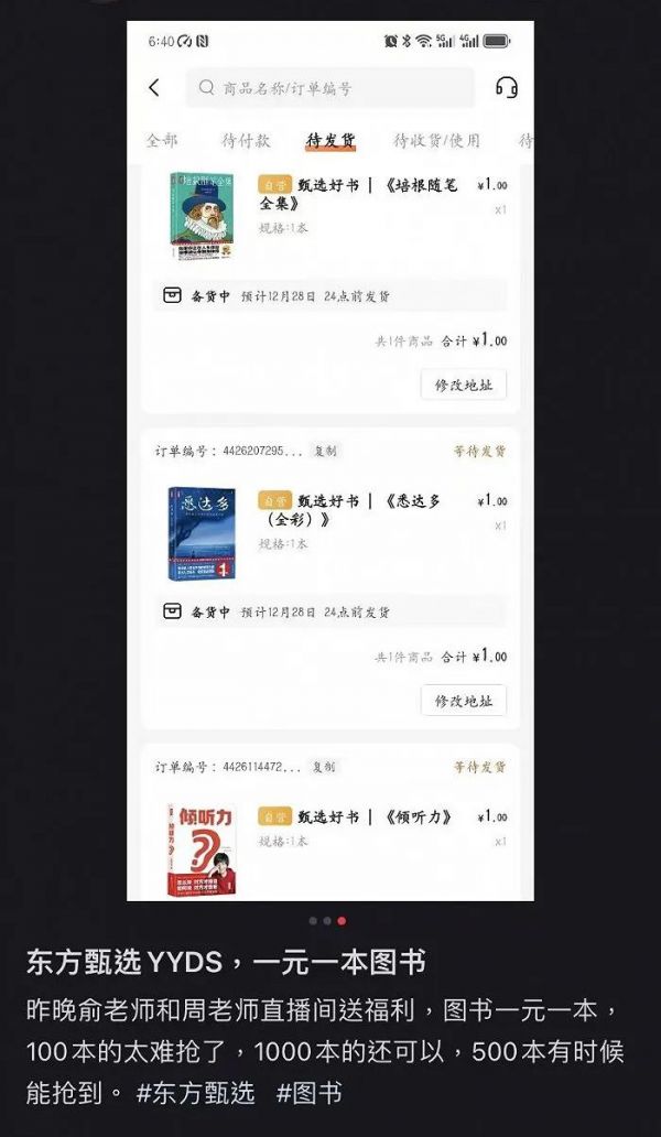 但参与本次抢书的读者少有疑虑,在此前东方甄选发布的微博“俞敏洪老师、周成刚老师与大家相约东方甄选App直播间,新年送好礼,5000本好书1元领”下方,不少网友打下了“期待”“不见不散”等评论,还有人调侃称“这是他俩谁的书又卖不出去了”。
