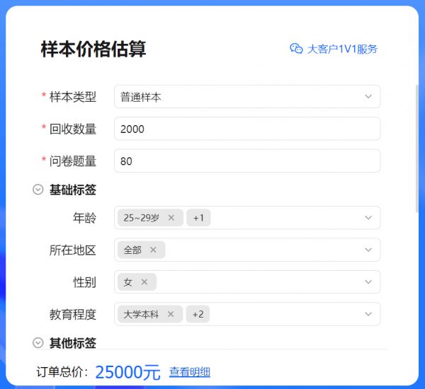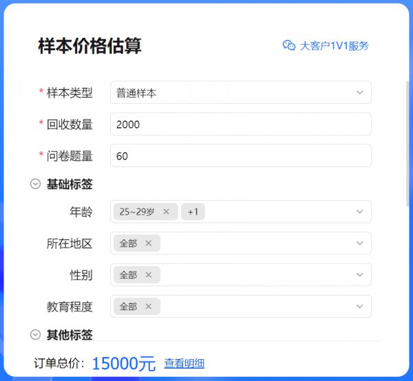 样本库的选择非常关键,一般第三方问卷平台自带的样本库或者其他第三方自建样本库量级通常在百万级别,两三百万就不错了,他们的样本价格便宜,平均10元上下,例如腾讯问卷,推送的人群标签越多越贵,题目数量越多越贵,但这样的样本库回收的数据质量谁也说不好。