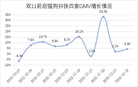Sandalwood电商监测数据显示,10月~12月上旬,猫狗抖快四家分周GMV增速由于去年基数较低,而有了恢复性增长。相较上季度略有改善,由同比增长5%,升至8%,其中抖音的表现最为强劲。