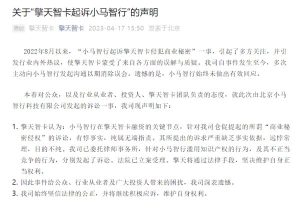 不过首笔融资之后,擎天智卡迟迟未等来第二笔融资。一名知情人士透露称,擎天智卡与小马智行的诉讼纠纷使其错过了融资的关键节点。据悉,2022 年 8 月,小马智行起诉擎天智卡侵犯商业秘密,随后在 2023 年 4 月擎天智卡以小马智行滥用知识产权的行为,及其不正当竞争的行为,分别发起了诉讼。