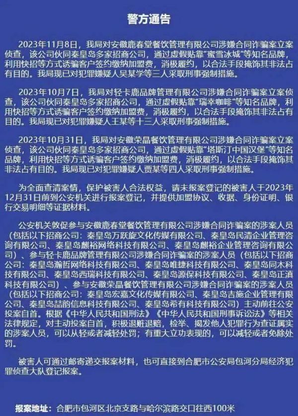 合肥包河区警方通告显示,轻卡鹿品牌管理有限公司、安徽鹿春堂餐饮管理有限公司、安徽荣晶餐饮管理有限公司。利用快招等方式诱骗客户签约缴纳加盟费,消极履约,以合法手段掩饰其非法占有目的,涉嫌合同诈骗,被立案侦查,相关犯罪嫌疑人已采取强制措施。