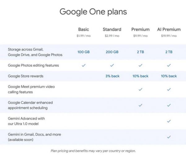 在 Google 推出新的 AI Premium 档位之前,Google One 原本有三个档位,每月 1.99 美元,每月 2.99 美元和每月 9.99 美元。新的 AI Premium 档位,虽然看起来是 19.99 美元,其中将赠送 9.99 美元档位的全部 Google One 服务。