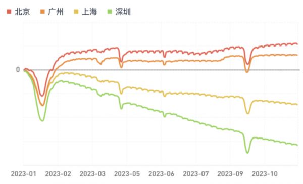 根据数据平台“城市数据团”对四个一线城市的人口净流动情况地统计,可以看到,2023年1~11月,四个一线城市中,北京、广州市的人口净流入累计值在2月9日之后才开始转正,但人口流入幅度并不大。而上海、深圳的人口净流入累计值,即使是2023年春节过后,也未能恢复到年初水平,且仍不断下降,也就是说这两个城市的人口出现了持续外流。其中,深圳市的人口流出速度,比上海更快。