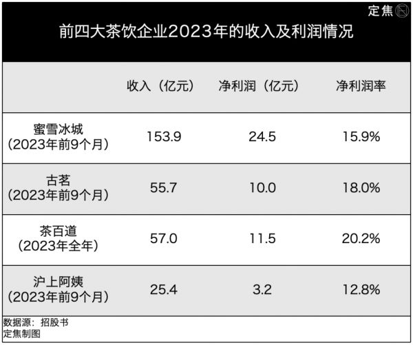 而招股书显示,不到三年时间(2021年、2022年、2023年前9个月),蜜雪冰城累计盈利超过64亿元;同期,古茗、茶百道、沪上阿姨分别累计盈利14亿元、30亿元、6亿元。