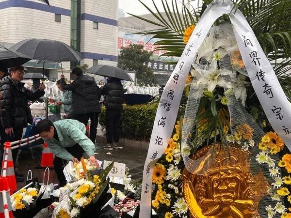 总部门口还摆了很多鲜花和AD钙奶,大多来自外卖小哥,他们接到来自全国各地的订单,代他们送上缅怀和敬意。有外卖订单上备注写着:“一代企业家 致敬宗总”“宗爷爷一路走好”等。