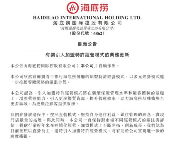 坚持30年直营的海底捞给出了自己的答案,它也放加盟了!