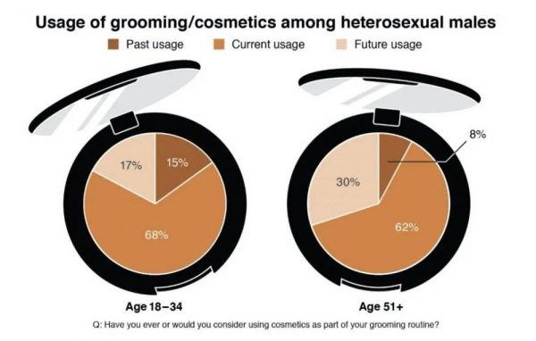 美国异性恋男性美容/化妆情况|来源:There’s a market for men’s cosmetics–and a generation gap