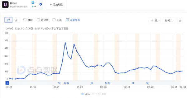 Umax 2023 年 11 月底上线,目前只推出了 iOS 版本,虽然流水不怎么高,2 月份内购收入 28.5 万美金,合约人民币 205 万,但下载量成绩不错,从 2024 年 1 月起,就实现了连续两个月全球下载量超过 80 万的成绩。