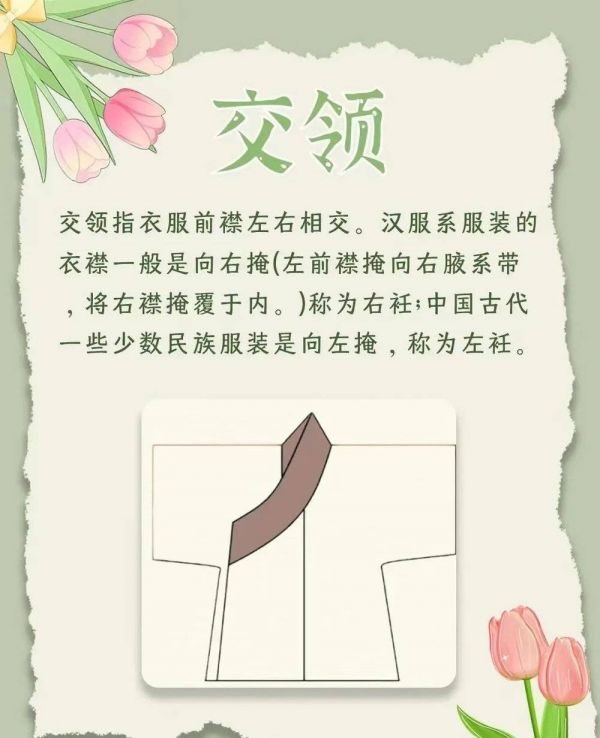 她举了一个具体的例子,汉服中常见的交领(前襟扣合方式),很多商家会做反,正确的形制应该为右衽,右衽是汉服始终保留的特点,也是汉族的象征,一般只有少数民族才会采用左衽。