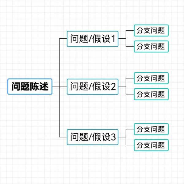 像这样,先用模型做横向拆分(从问题陈述到问题1、2、3),再用MECE法则做纵向拆分(从问题1到分支问题),我们就得到了一个问题树。看图。