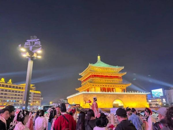 商场的南边不远处能看到西安著名古建筑城墙,北边两百多米外,矗立着钟楼。白天,钟楼上的琉璃瓦通体泛绿,到了晚上,四面的射灯打过来,楼体变得金碧辉煌。周末,穿汉服的姑娘们开始往钟楼附近围聚,她们身穿红、白披风,手摇团扇,用各色簪子把发髻高高盘起,谈笑间从容自信。给人一种误入古装剧片场的感觉。