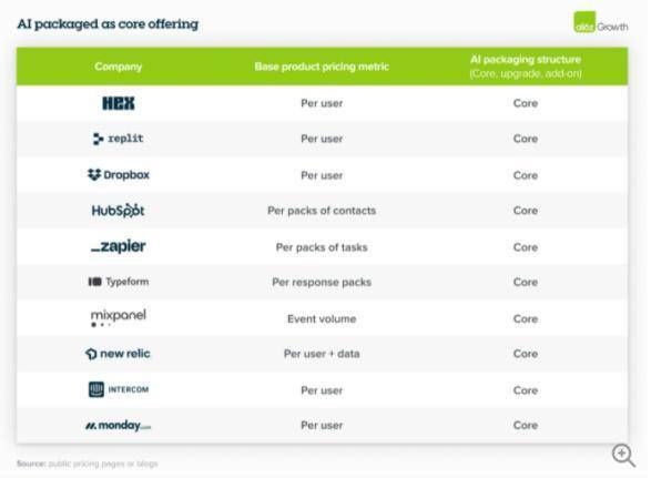 目前,a16z看到一些公司将基础性能的GenAI功能包含在核心产品或基础版本中,并在更高版本产品中引入更强大的GenAI功能,或提供更多GenAI功能。