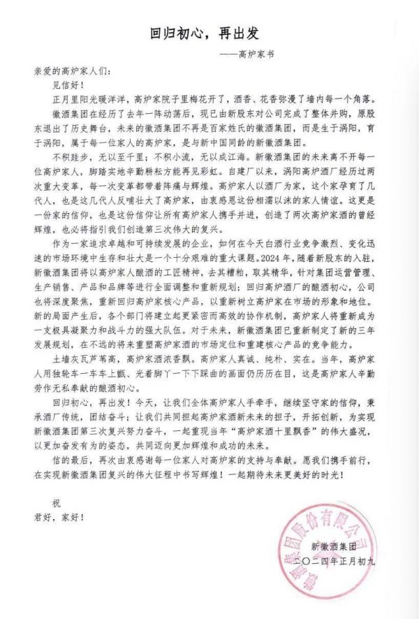 2月18日,高炉家官方微信公众号发布题为《回归初心,再出发》的高炉家书(下简称家书),其中提到:徽酒集团在经历了去年一阵动荡后,现已由新股东对公司完成整体并购,原股东退出了历史舞台。