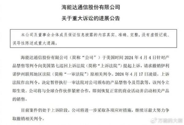 通过海能达的不断努力,目前禁令问题终于得到暂时解决。4月17日,海能达发布公告,披露公司针对产品禁售的判令向美国上级法院提起上诉,当日凌晨上诉法院作出判令,决定暂停产品禁售令及罚款,海能达“即刻恢复正常的商业活动并启动相关产品的销售”。这也说明之前他们选择配合禁令而不是对抗的判断是正确的,也是损失最小的。只不过案件仍处于上诉阶段,撤销判令依旧需要努力,海能达本身的遭遇,还是需要当下的中国企业尤其是科技企业注意。