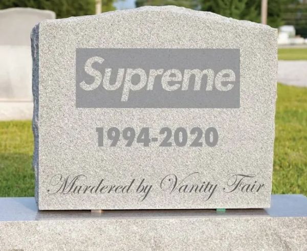 2020年,Supreme被Vans、The North Face的母公司VF集团以逾21亿美元的价格收购,Supreme被卷入了资本和商业市场的角力。当小众的神秘光环被打破,曾经崇尚自由和叛逆的信徒便纷纷离去。著名Supreme收藏家Eric Whiteback甚至制作了一张“Supreme死于2020年,被VF谋杀”的图片。
